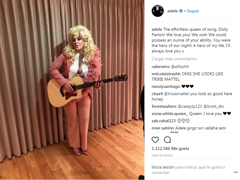 "¡La reina de la canción sin esfuerzo, Dolly Parton! ¡Te amamos! Desearíamos poseer un ápice de tu talento. Tú fuiste la heroína de nuestra noche. La heroína de mi vida. Siempre te querré", escribió la cantante junto a la foto que ya superó el millón de "Me gusta" en sólo un par de horas.