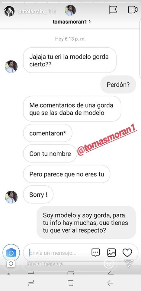 Así lo dejó en evidencia la modelo de talla grande en sus historias de Instagram, donde reveló el desagradable intercambio de palabras que tuvo con un usuario que se burlaba de su cuerpo, preguntándole en un principio si acaso ella es "la modelo gorda", para finalmente terminar agrediéndola con una imagen de su rostro y una nariz de cerdo.
