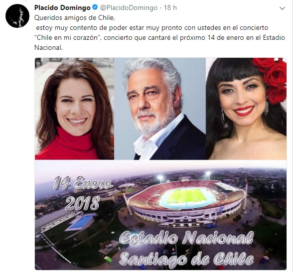 "Estoy muy contento de poder estar muy pronto con ustedes en el concierto 'Chile en mi corazón', concierto que cantaré el próximo 14 de enero en el Estadio Nacional", señaló el tenor a través de una publicación en su cuenta de Twitter.