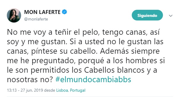 "No me voy a teñir el pelo, tengo canas, así soy y me gustan. Si a usted no le gustan las canas, píntese su cabello", partió escribiendo la arista en su cuenta de Twitter. Además la cantante criticó la diferencia social que hay sobre este tema en relación con los hombres.