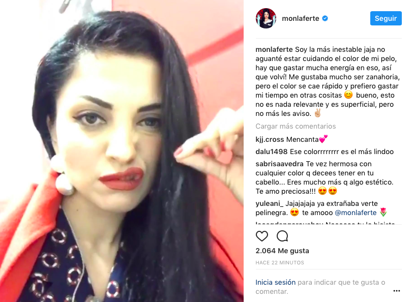 A través de su cuenta de Instagram, la viña marina quiso compartir con su casi medio millón de seguidores lo que se había hecho con su típico estilo. La imagen publicada donde vemos que volvió a su pelo negro estaba acompañada de un divertido mensaje que decía: "soy la más inestable jaja no aguanté estar cuidando el color de mi pelo, hay que gastar mucha energía en eso, así que volví!"