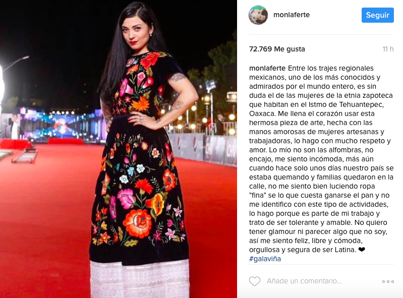 Uno de los trajes que más llamó la atención durante la gala de Viña 2017 fue el de la cantante Mon Laferte, ya que vistió un traje típico de las mujeres de la etnia zapoteca que habitan en el istmo de Tehuantepec, México.