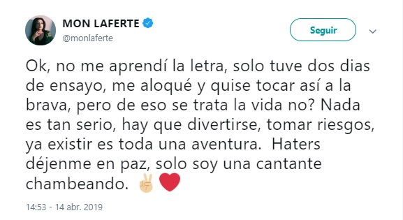 Y aunque muchos aclamaron esta versión, otros la criticaron por el hecho de cantar con "torpedo" en mano... Eso sí, Mon Laferte no se quedó callada y respondió este domingo a sus "haters".