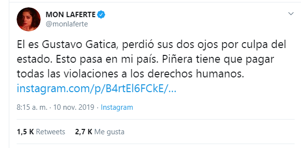 Este rechazo aumentó luego de que se diera a conocer la noticia de Gustavo Gatica, el joven que perdió su vista luego de recibir perdigones por parte de Carabineros. Fue aquí, donde la artista escribió "El es Gustavo Gatica, perdió sus dos ojos por culpa del estado. Esto pasa en mi país. Piñera tiene que pagar todas las violaciones a los derechos humanos".