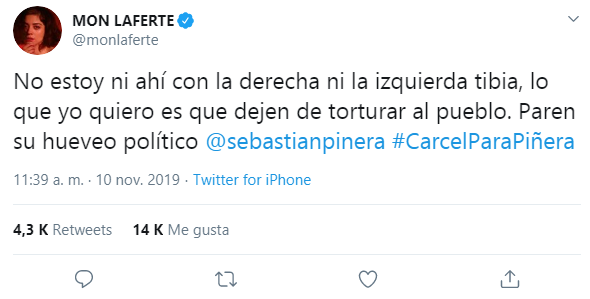 También la artista no ha dudado a la hora de expresar su opinión a través de sus redes sociales, donde ha sido enfática en rechazar la gestión del actual Gobierno y especialmente del presidente, Sebastián Piñera.