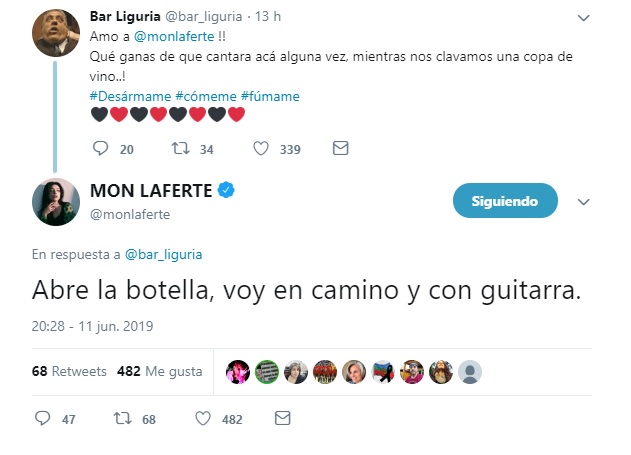 La intérprete de "El Beso" había dejado entrever que haría una presentación en un bar capitalino, sin contar mucho más. Eso hasta poco antes del show, pues al responder al tuit de Bar Liguria, confirmó la locación.