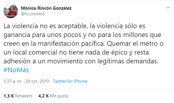 "Lo que estoy tratando de dar como contexto es qué pasa en ese punto, a qué aluden los carteles y rayados de quienes llegan hasta el metro Baquedano. Es una explicación de qué quieren decir los rayados. Y evidentemente esa o cualquier razón que lleve a la violencia es injustificado por si no ha quedado claro", sentenció.