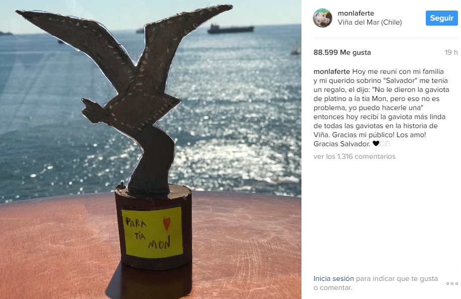 Por esta razón, su sobrino Salvador quiso que la intérprete de "Tu falta de querer" se llevara para la casa una tercera gaviota y sacó suspiros con un tierno regalo: la fabricó con sus propias manos. Así lo dio a conocer Mon Laferte a través de su cuenta de Instagram. "Hoy me reuní con mi familia y mi querido sobrino 'Salvador' me tenía un regalo, el dijo: 'No le dieron la gaviota de platino a la tía Mon, pero eso no es problema, yo puedo hacerle una' entonces hoy recibí la gaviota más linda de todas las gaviotas en la historia de Viña. Gracias mi público! Los amo! Gracias Salvador", escribió junto a la imagen.