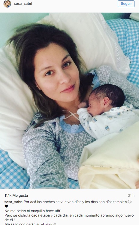 "Por acá las noches se vuelven días y los días son días también... No me peino ni maquillo hace ufff, pero se disfruta cada etapa y cada día, porque en cada momento aprendo algo nuevo de él. Me salió con carácter el niño. Escribió Sabrina Sosa en su cuenta de Instagram, con una foto que compartió junto a su hijo.