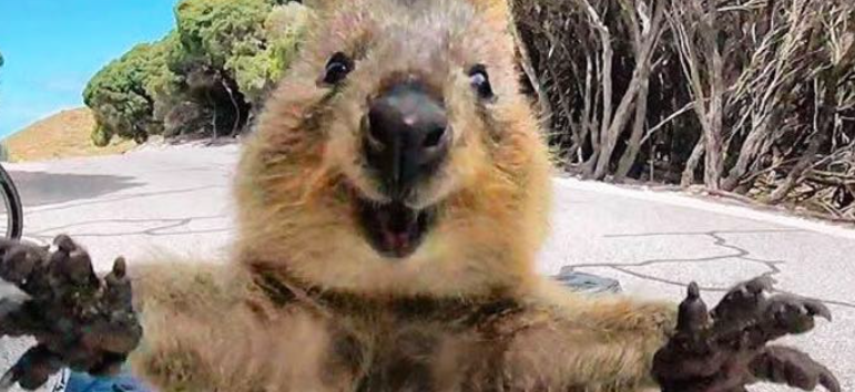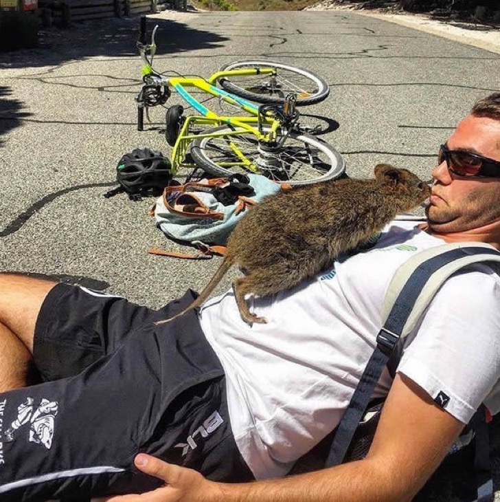 Andando en bicicleta por Australia se encontró con un Quokka, un marsupial australiano similar a los canguros, que apenas lo vio saltó a los brazos del joven.