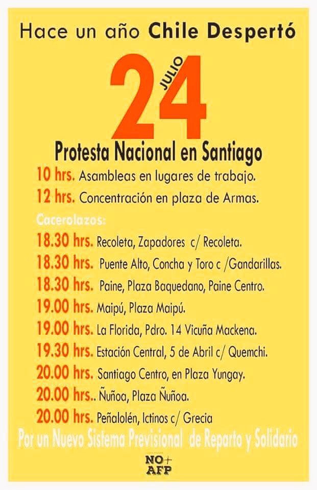 Durante el mediodía se realizó una concentración en Plaza Italia. "El balance es positivo porque el tema está en la agenda pública a pesar de la invisibilidad que busca darnos el gobierno. Hemos ganado un 5% más. A pesar de la campaña que ha hecho el ministro de Hacienda, la ciudadanía sigue expresando adhesión, pero todavía nos falta mucho, con tan poco que hemos ganada tanto, pero nos falta, nuestro mandato es acabar con las AFP y para allá vamos”, detalló esta mañana Luis Mesina, vocero de la Coordinadora, según diario "La Tercera".