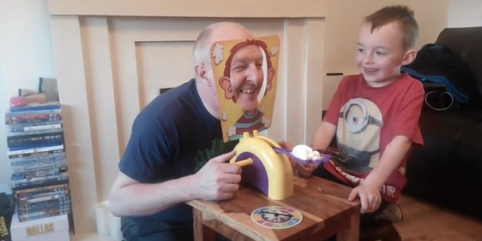 Se trata del pastelazo, un entretenido juego con el que un abuelo se divierte junto a su nieto, los que se ríen con cada una de las cosas que deben realizar mientras juegan. Aquí, un brazo de plástico sostiene una cantidad de crema, la cual es lanzada al rostro. El reciba la mayor cantidad de tortazos en la cara es el perdedor.