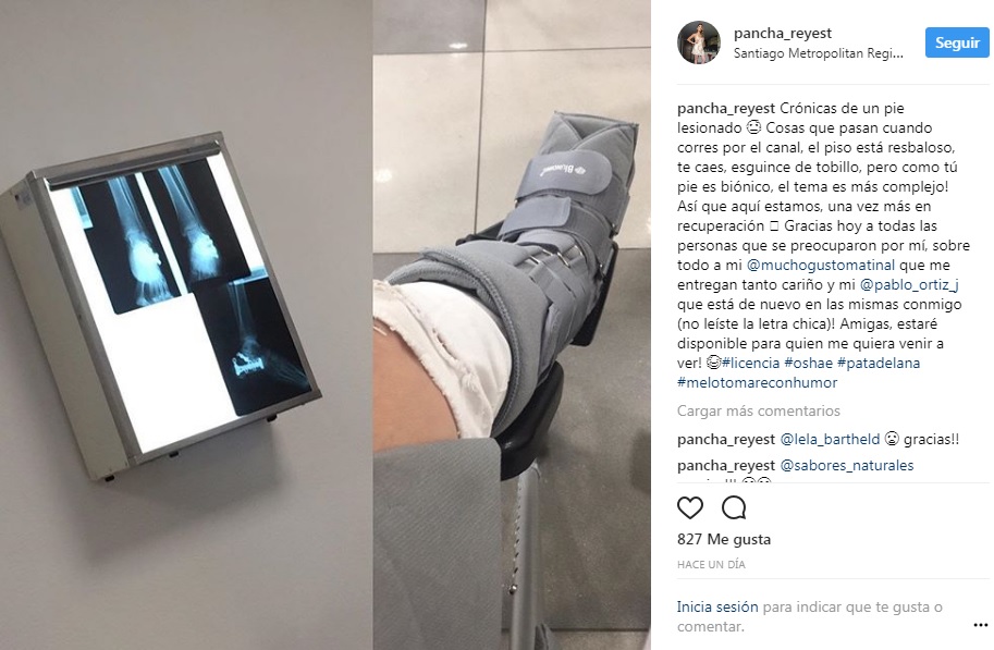 A través de su cuenta de Instagram, Reyes reveló que "Crónicas de un pie lesionado. Cosas que pasan cuando corres por el canal, el piso está resbaloso, te caes, esguince de tobillo, pero como tu pie es biónico, el tema es ¡más complejo! Así que aquí estamos, una vez más en recuperación".