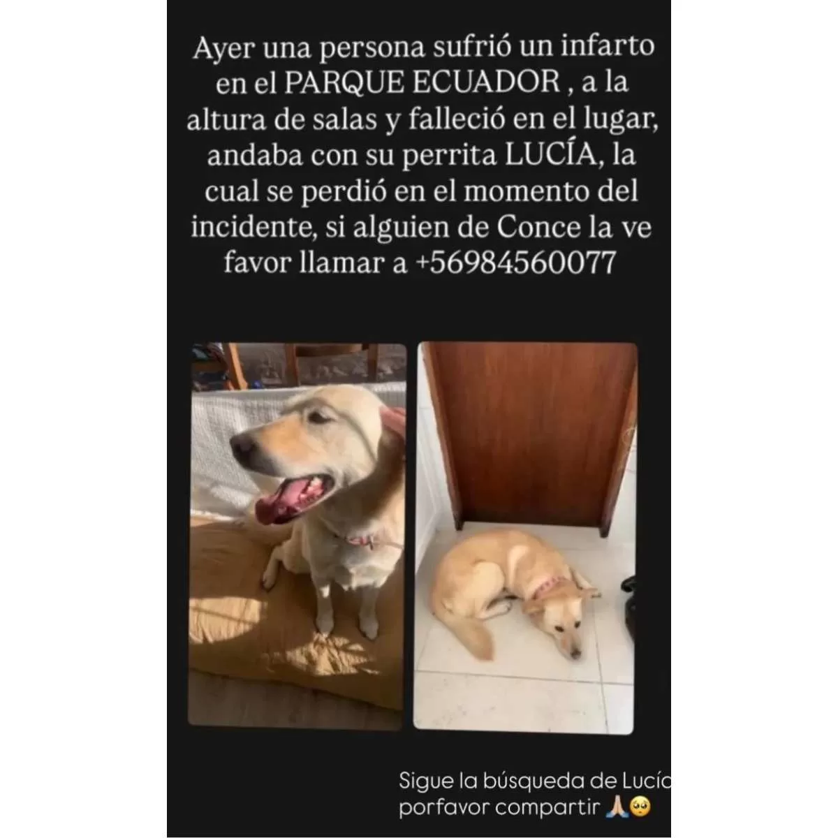 "Ayer una persona sufrió un infarto en el Parque Ecuador, a la altura de Salas, y falleció en el lugar. Andaba con su perrita, Lucía, la cual se perdió en el momento del incidente", señaló un posteo en redes sociales.