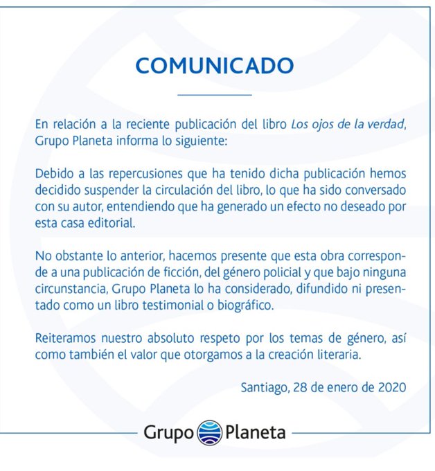 Finalmente, esta semana la editorial Planeta anunció que “debido a las repercusiones que ha tenido dicha publicación hemos decidido suspender la circulación del libro”.