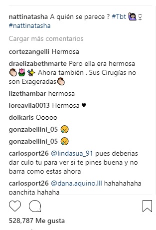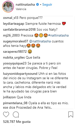 La foto llegó a tener sobre 500 mil "me gusta", recibiendo comentarios positivos respecto a lo tierna que se ve en la imagen, pero también algunos que destacaron lo diferente que se ve actualmente a lo que era cuando niña, debido a procedimientos que Natti Natasha se ha sometido a través de los años.