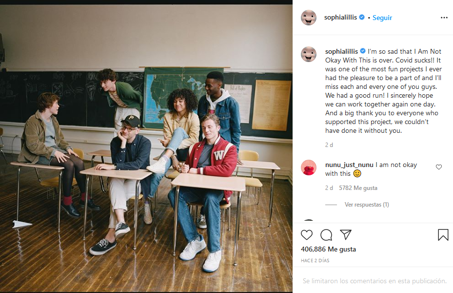 La protagonista de “Esta mierda me supera”, Sophia Lillis, publicó en su cuenta de Instagram: “Estoy tan triste porque no estoy de acuerdo con esto. Esto se acabó. El Covid apesta !! Fue uno de los proyectos más divertidos en los que tuve el placer de ser parte y los extrañaré a todos y cada uno de ustedes. ¡Tuvimos una buena carrera! Espero sinceramente que podamos volver a trabajar juntos algún día. Y un gran agradecimiento a todos los que apoyaron este proyecto, no podríamos haberlo hecho sin ustedes”.