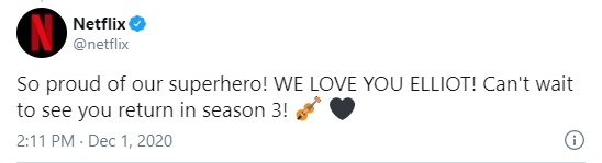 '¡Muy orgullosos de nuestro superhéroe! ¡TE AMAMOS ELLIOT! ¡No podemos esperar a verte regresar en la temporada 3!'.