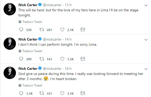 "Que Dios nos conceda algo de paz durante estos momentos. Tenía muchas ganas de conocerla después de estos tres meses. Tengo el corazón roto", escribió Nick Carter a través de su red social.
