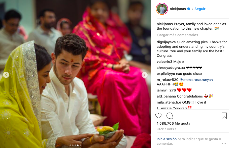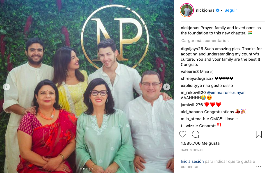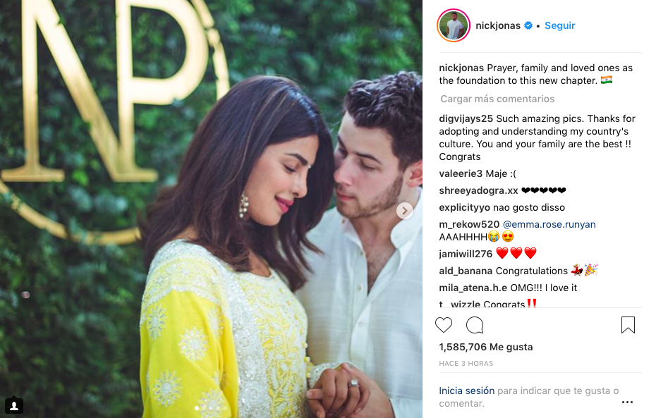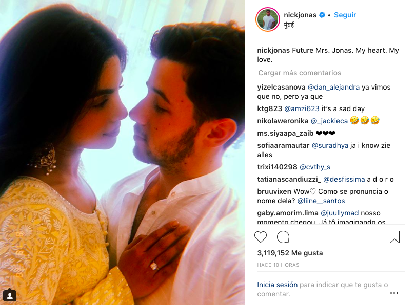 Así lo anunció el actor y cantante Nick Jonas, quien usó sus redes sociales para confirmar su compromiso con la actriz Priyanka Chopra. Nick compartió la frase "Futura señora Jonas. Mi corazón. Mi amor" junto a una serie de fotos de su ceremonia de compromiso.