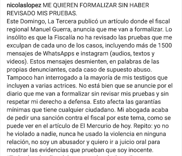 "Tampoco han interrogado a la mayoría de mis testigos que incluyen a varias actrices. No está bien que se anuncie por el diario que me van a formalizar sin revisar mis pruebas y sin respetar mi derecho a defensa. Esto afecta las garantías mínimas que tiene cualquier ciudadano. (...) Repito: yo no he violado a nadie, nunca he usado la violencia en ninguna relación, no soy un abusador y quiero ir a juicio oral para mostrar las evidencias que prueban que soy inocente", escribió el hombre detrás de éxitos como "Sin filtro" y "No estoy loca".