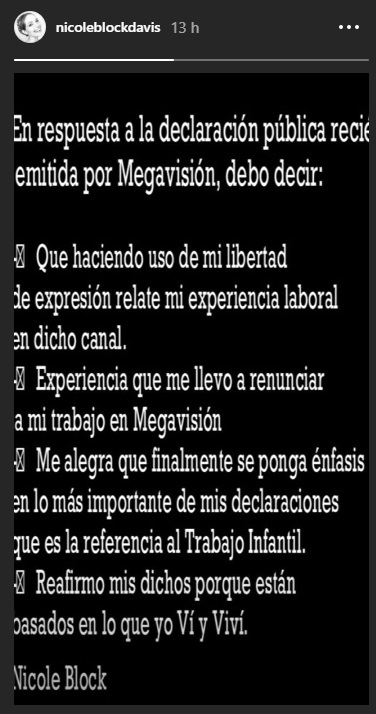 “Haciendo uso de mi libertad de expresión, relaté mi experiencia laboral en dicho canal. Experiencia que me llevó a renunciar a mi trabajo en Megavisión (…) Me alegra que se ponga énfasis en lo más importante de mis declaraciones, que es la referencia al trabajo infantil”, fue lo que aclaró la nuera de Delfina Guzmán.
