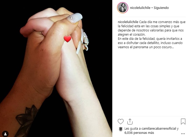 "Cada día me convenzo más que la felicidad está en las cosas simples y que depende de nosotros valorarlas para que nos alegren el corazón. En este día de la felicidad, quería invitarlos a eso a disfrutar cada detallito, incluso cuando veamos el panorama un poco oscuro", escribió Nicole para acompañar una foto en la que se ven sus manos entrecruzadas con las de su hijo.