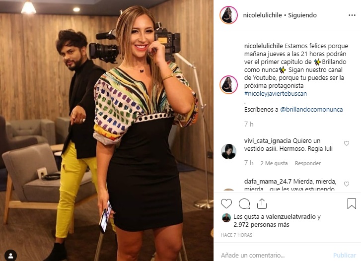 "Estamos felices porque mañana jueves a las 21 horas podrán ver el primer capitulo de ✨Brillando como nunca✨ Sigan nuestro canal de Youtube, porque tu puedes ser la próxima protagonista #nicoleyjaviertebuscan", escribió Nicole.