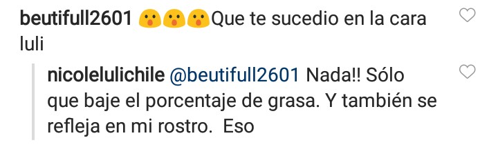 'Nada! Solo que bajé el porcentaje de grasa. Y también se refleja en mi rostro. Eso', respondió 'Luli'.