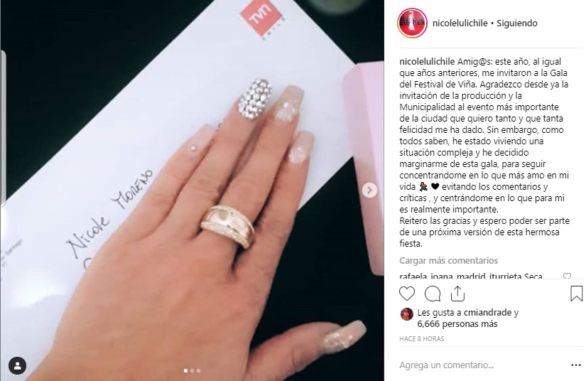 A través de su cuenta en Instagram, Nicole Moreno agradeció la invitación, pero declaró que este año no asistirá a la Gala festivalera, debido al panorama que atraviesa con su hijo recluido en un centro del Sename.