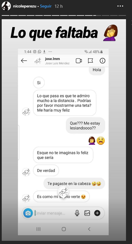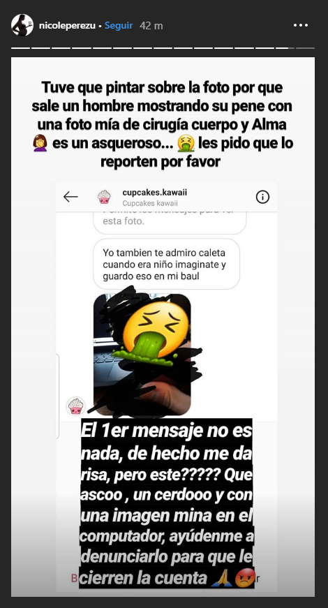 «El 1er mensaje no es nada, de hecho me da risa, pero este???? Que asco, un cerdo y con una imagen mia en el computador, ayúdenme a denunciarlo para que le cierren la cuenta», escribió Nicole en uno de los mensajes.