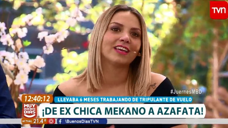 La ex chica Mekano, señaló que su labor como tripulante de cabina la tenía muy feliz "Es una pega maravillosa, muy sacrificada, pero linda. El ambiente que se arma con los pares es muy entretenido, y sobre todo con los pasajeros", reveló en su entrevista.