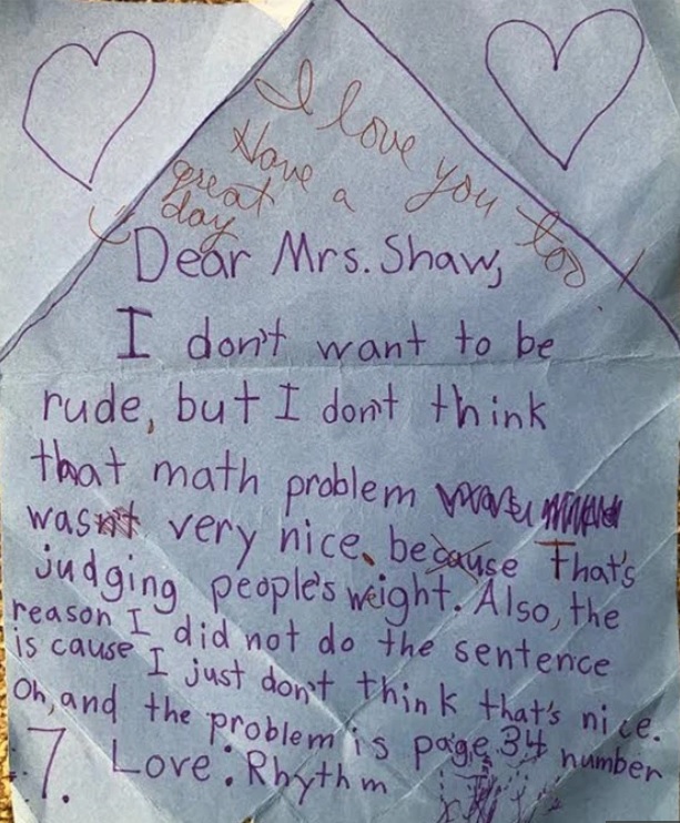 Luego agregó en una carta dirigida a su profesora: "No quiero ser grosera, pero no creo que el problema matemático haya sido muy bueno porque eso es juzgar el peso de las personas. Además, la razón por la que no quise responder es porque simplemente no creo que sea bueno. Con amor, Rhytm".