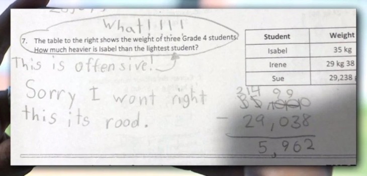 "La tabla a la derecha muestra el peso de tres estudiantes de cuarto grado ¿Cuánto más pesa Isabel que la estudiante más delgada?", planteaba el problema matemático. Ante esto, la niña respondió: "¡¿Qué?! Esto es ofensivo. Lo siento, no voy a corregir esto, es grosero".