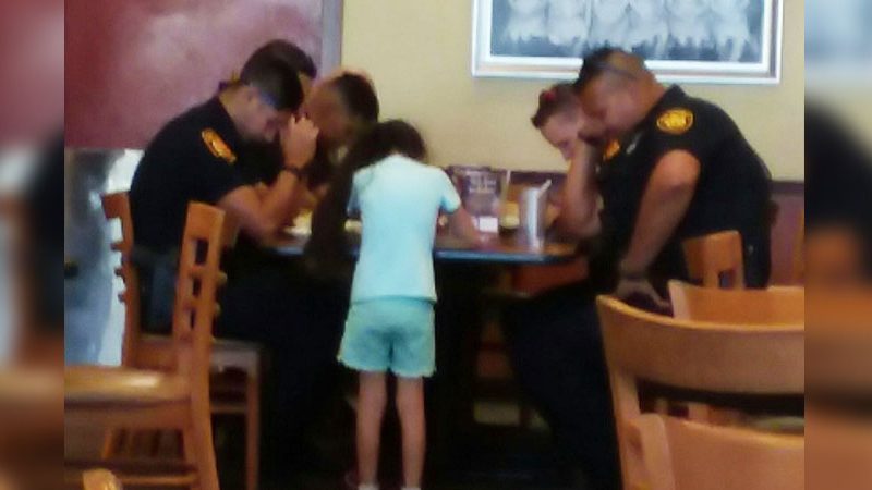 "Paige rezando por nuestros hombres de azul. Ocho oficiales cenaban cuando ella llegó a la mesa y les preguntó si podía orar por ellos para que estuvieran seguros y para que Dios los cuidara. Debo decir que todos inclinaron su cabeza cuando terminaron de comer. Luego un oficial se acercó a nuestra mesa para decir gracias", escribió Bosquez en Facebook, donde la imagen ha sido compartida más de 4 mil veces.