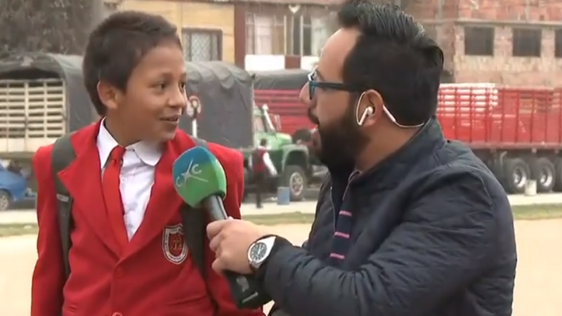 Mientras iba camino al colegio, un niño colombiano fue entrevistado por un periodista del programa Despierta Bogotá del Canal Capital. Pero la entrevista no pudo llegar a su fin, ya que el niño tuvo que irse para no llegar tarde a clases ¡Un ejemplo a seguir!