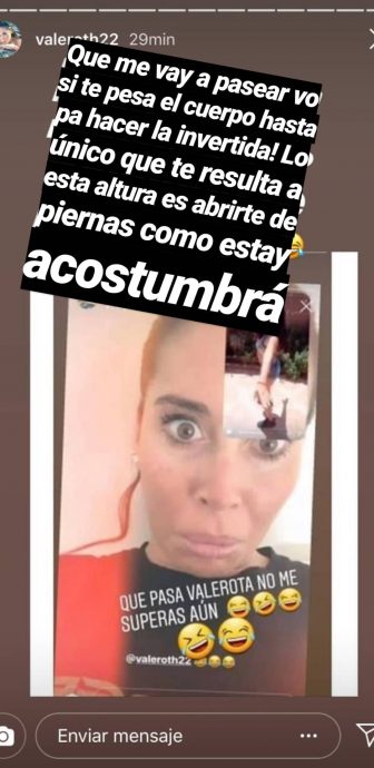 Y este viernes estos dos rostros televisivos volvieron a enfrentarse en redes con mensajes bien potentes, que comenzaron con Valentina burlándose con la ganadora de "Mundos opuestos", al publicar un video bailando en sus historias de Instagram.