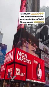 Mon Laferte está cerrando este año con el lanzamiento de 'Norma', su quinta producción discográfica, demostrando su éxito durante 2018. Su carrera se ha internacionalizado a tal punto, que hoy se pudo ver en Times Square, el aviso de nuevo disco de la artista nacional.