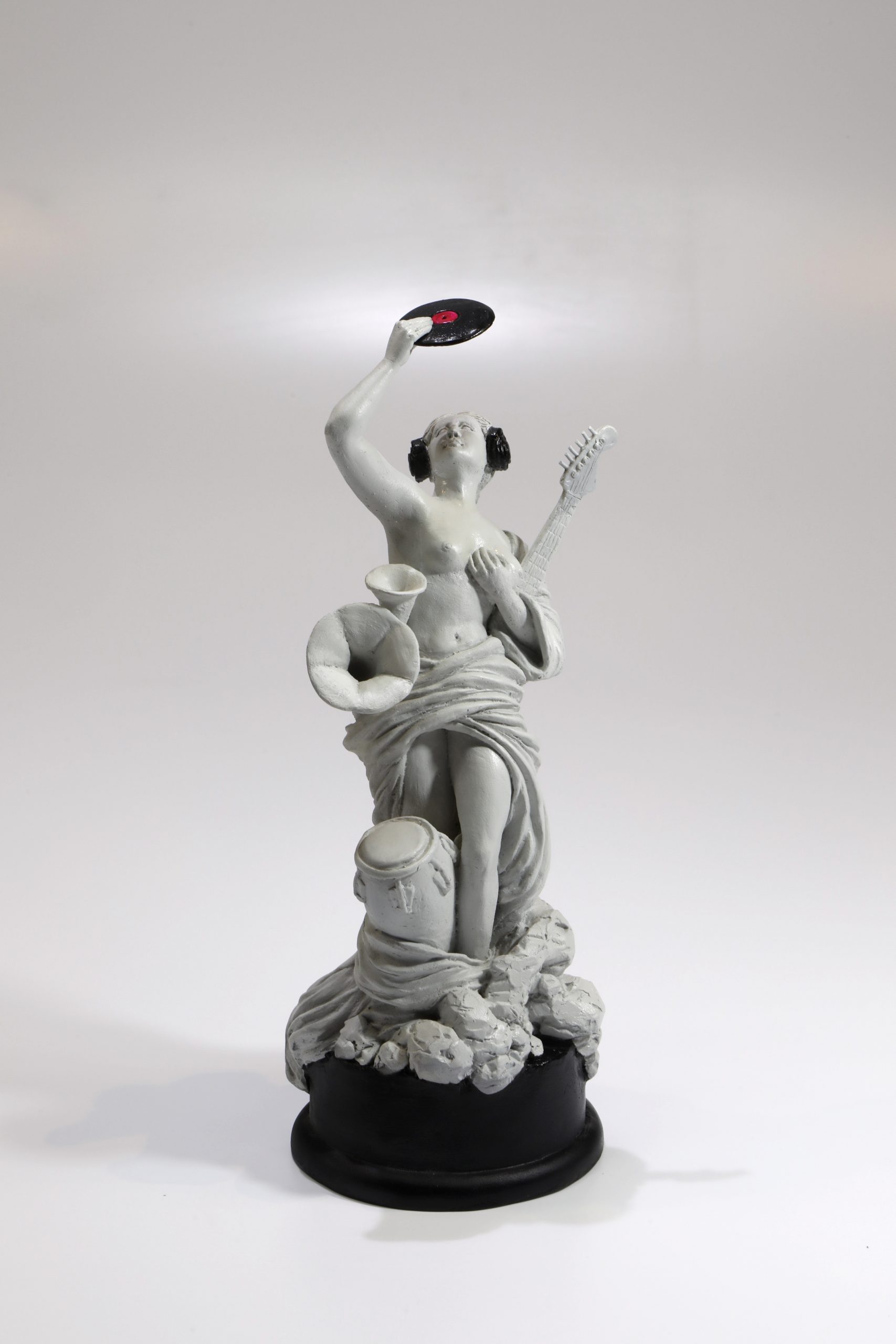 La escultura, de impresionante textura visual, se genera con la figura de una mujer con audífonos que contempla las estrellas a través del orificio de un vinilo, al mismo tiempo que sostiene su busto y afirma su cuerpo con el mástil de una guitarra. La base la completan elementos sonoros, como trompetas, tambor y parlantes, que visten sus piernas desde la raíz.