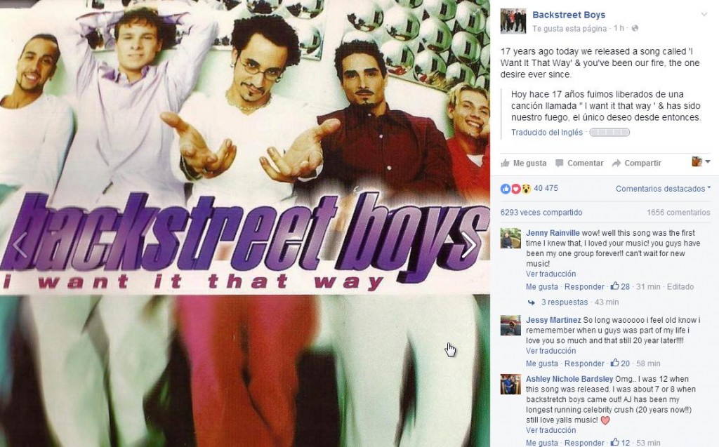 Aunque ha pasado el tiempo, Nick, Brian, Kevin, Howie y A.J se han quedado en los corazones de sus fans, quienes junto a ellos celebraron este martes, 17 años de "I want it that way", primer sencillo de su disco "Millenium", lanzado en 1999 y considerado como su mayor hits. Esta canción logró el primer lugar en más de 25 países y estuvo 23 semanas seguidas en las listas del United World Chart Singles, hecho que la convirtió en la canción más exitosa de una boyband.