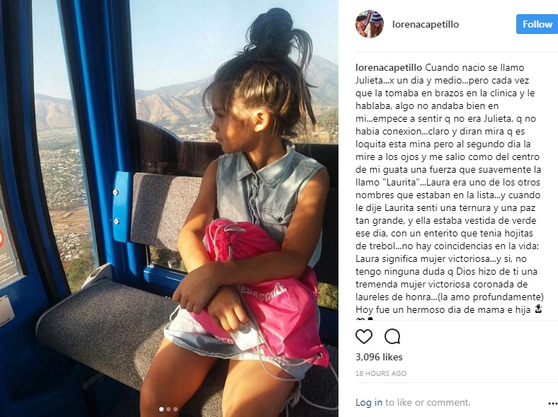 Y con un emotivo mensaje, Lorena explica que "Claro y dirán mira que es loquita esta mina pero al segundo día la miré a los ojos y me salió como del centro de mi guata una fuerza que suavemente la llamo "Laurita"...Laura era uno de los otros nombres que estaban en la lista...y cuando le dije Laurita sentí una ternura y una paz tan grande, y ella estaba vestida de verde ese día, con un enterito que tenía hojitas de trébol...no hay coincidencias en la vida: Laura significa mujer victoriosa...y sí, no tengo ninguna duda que Dios hizo de ti una tremenda mujer victoriosa coronada de laureles de honra".