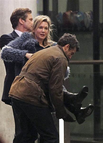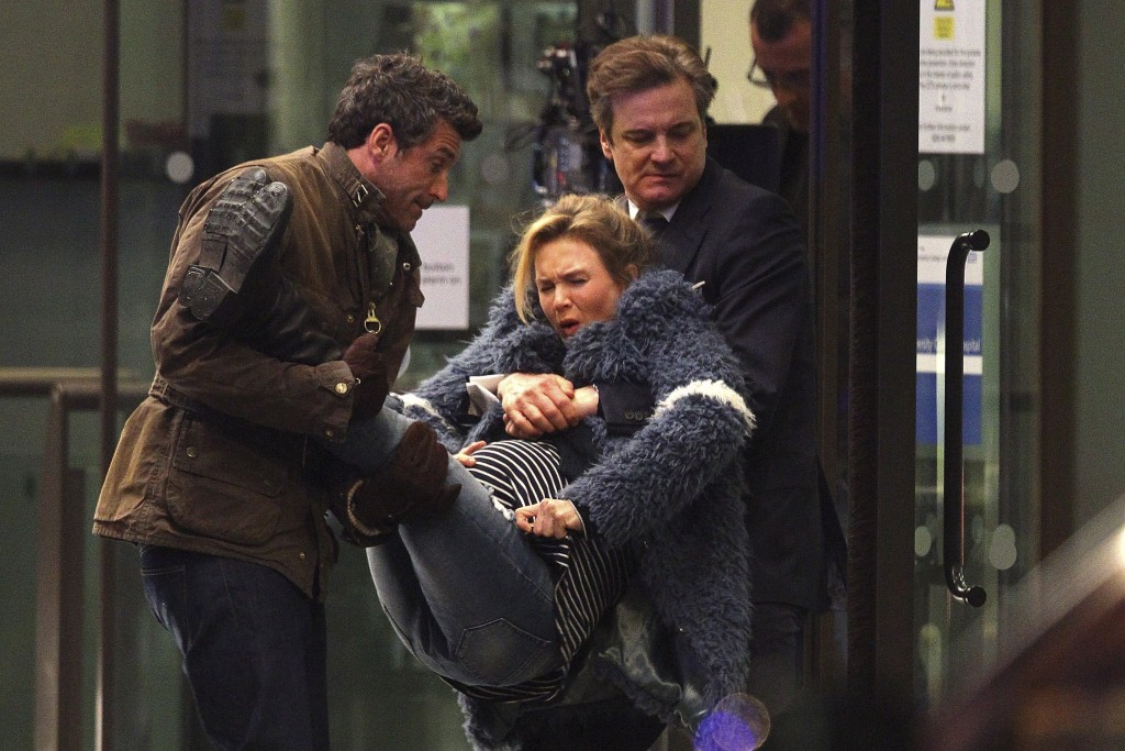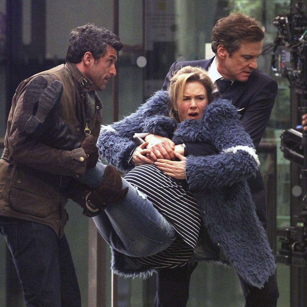 La actriz aparece con los dos galanes del filme, Colin Firth (que interpreta a Mark Darcy) y Patrick Dempsey en una escena que parece ser el instante en que deben correr al hospital para que nazca el bebé. ¡Qué emoción!