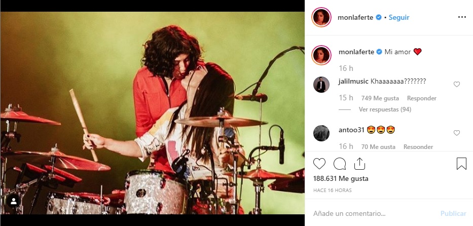 La intérprete de "Tu falta de querer" suele ser muy reservada sobre este tema, pero este lunes sorprendió a sus seguidores al compartir en su cuenta de Instagram una cariñosa postal. En la imagen se ve a Mon casi besando a su baterista, Natalia Pérez, más conocida como Cancamusa. "Mi amor", fue el mensaje con el que acompañó la fotografía.