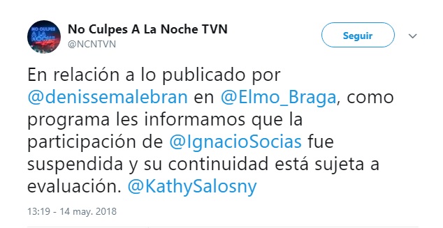 Y si bien Ignacio Socías pidió disculpas a Denisse por sus ofensivos dichos emitidos en ese entonces, el canal público de todas formas no permitió que iniciara su participación en el nuevo late de Katherine Salosny, que arrancó este lunes 14 de mayo.