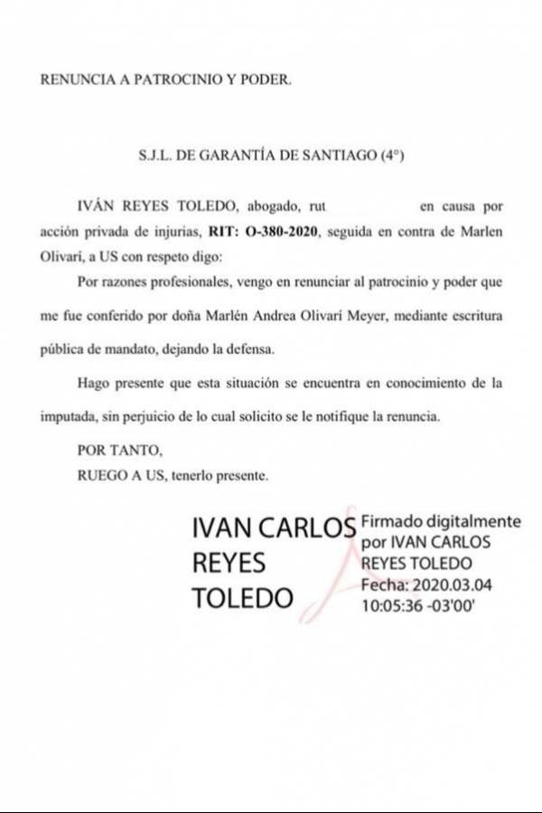 Y es que el abogado de Marlén Olivari, Iván Reyes, renunció a defenderla durante el proceso judicial.