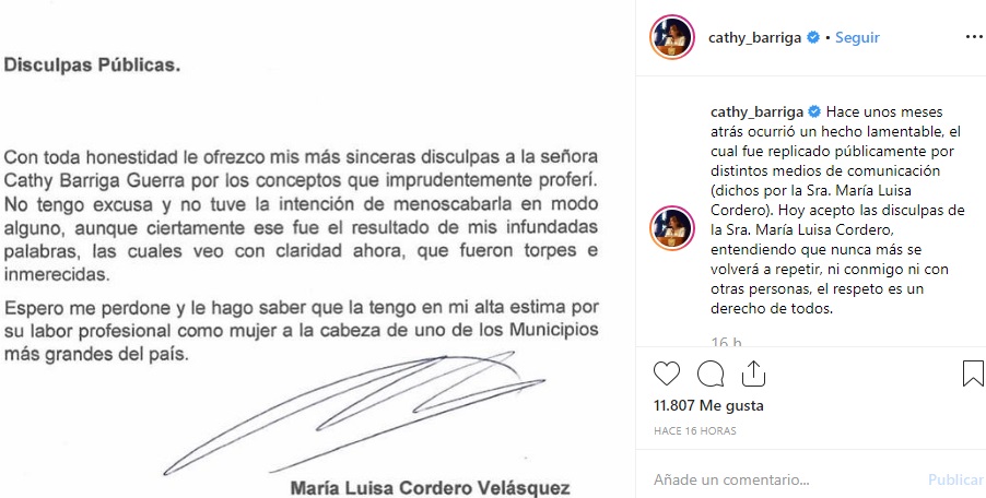 En una carta la doctora Cordero pidió 'disculpas públicas' a Barriga, quien compartió la disculpa en sus redes sociales, comentando que las acepta y las deja atrás.