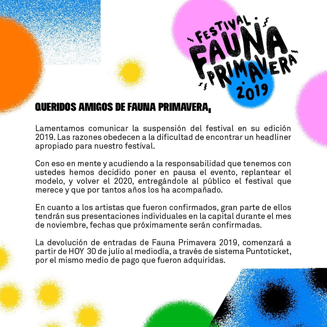 Y pese a que la fecha y el lugar ya estaban fijadas, la productora tuvo que cancelar el evento. El festival Fauna Primavera iba a ser el 9 de noviembre en Espacio Brodway.