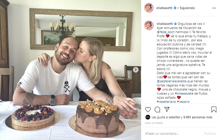 'Orgullosa de vos!! Ayer almuerzo de titulación de @fede_koch hermoso!! Te felicito Profe. Sé lo que amas tu trabajo y lo lindo de tu corazón por esa educación pública y de calidad!!!! Con profesores como vos, mega jugados!!! Cómo decís vos, inculcar el deporte es algo que salva vidas de chicos vulnerables, no puede ser jamás una asignatura optativa. Te adoro!!!!', escribió Albasetti en su red social.