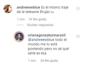 A través de su cuenta de Instagram compartió algunas postales de su atuendo y los seguidores chilenos de Oriana, no tardaron en notar el detalle. "Es el mismo traje de la teleserie Brujas", le escribió una usuaria, mientras otra comentó que hasta se parecía a Mane Swett.