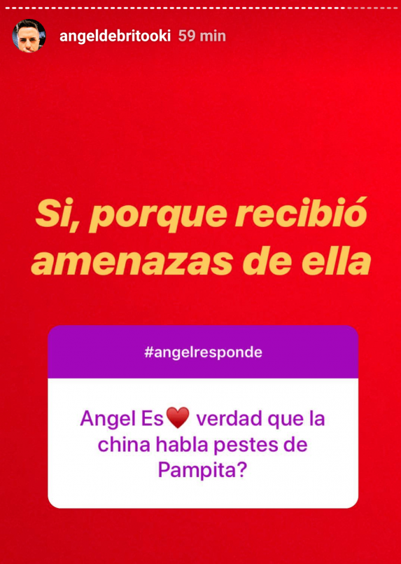 Y ahora una nueva polémica ha salido a la luz, ya que Ángel de Brito respondió preguntas en su Instagram, y cuando un seguidor le preguntó si es verdad que la "China" "habla pestes de 'Pampita'". Este respondió que "Sí, porque recibió amenazas de ella".